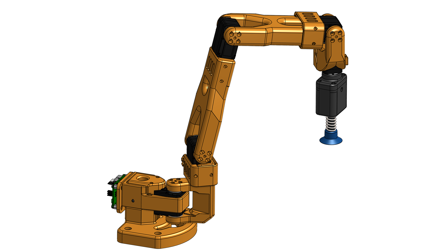 Exploded drawing view of assembly, featuring PLA enclosure and vertebrae, TPU shaft, 4 MG90s servos, Arduino board, and MPU-9250 6-axis gyroscope for sensing and positioning of end-effector.